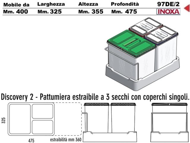 pattumiera art.97DE/2 cucina sottolavello estrazione frontale 3 secchi raccolta differenziata x base 40 a 120