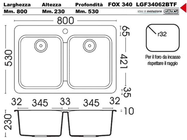 LGF34062BTP - Lavello Elleci fox 340 LGF34062BTP 80X53 2 Vasche incasso cucina Granitek 62 Bianco Antico