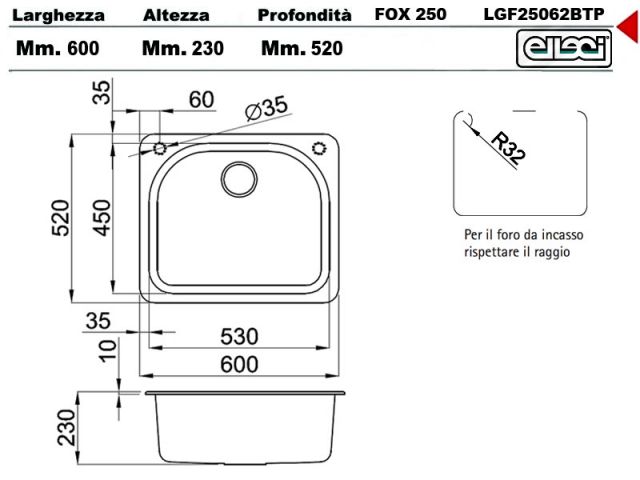 Base: 600 - Foro d'incasso: 580 x 500 mm