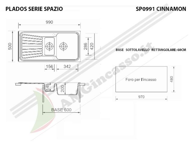 SP0991 - Lavello Plados Serie Spazio SP0991 1 vasca e mezza con gocciolatoio incasso cucina colore Cinnamon