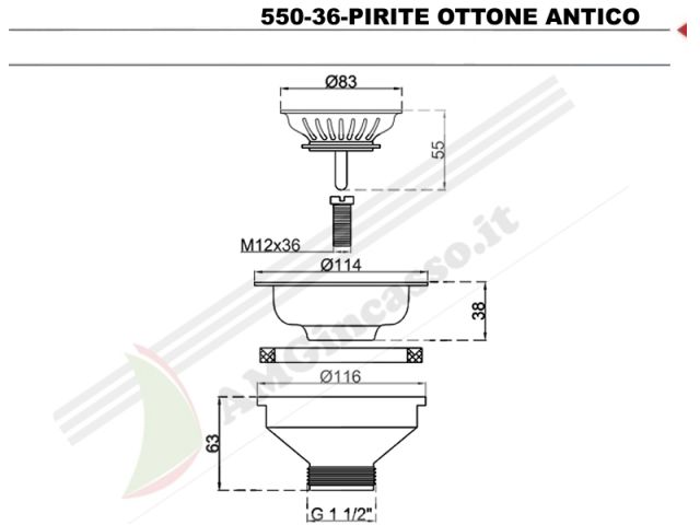 550-36-PIRITE - Piletta Basket 3½ Ø114 L.B.PLAST 550-36-PIRITE Lavello incasso cucina tappo cestello vite da 36 mm senza troppo pieno Ottone Anticato
